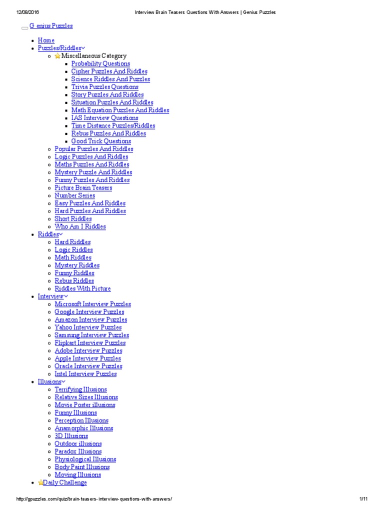 Enjoy 3500+ puzzles and brainteasers for kids and their parents, for teens and adults. Are you preparing for the competitive exams? Home puzzles/riddles miscellaneouscategory probabilityquestions cipherpuzzlesandriddles scienceriddlesandpuzzles triviapuzzlesquestions documents similar to interview brain teasers questions with answers _ genius puzzles.pdf. But why haven't you pursued puzzles? i haven't just quit working with puzzles. Scroll down the page to read the questions.
